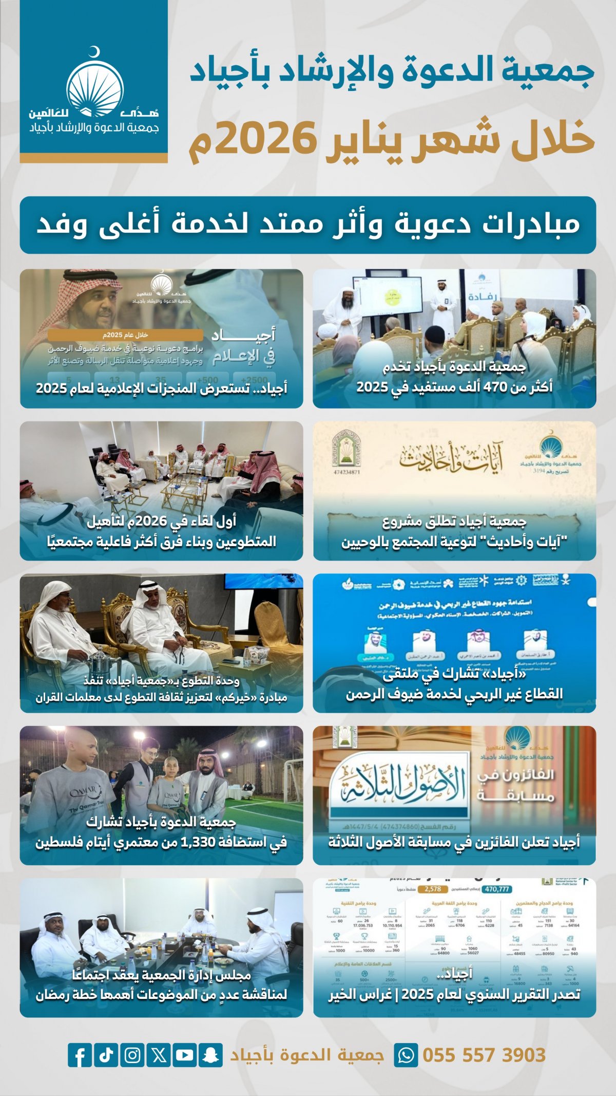 واصلت جمعية الدعوة والإرشاد بأجياد، خلال شهر يناير 2026م، مسيرتها في العطاء عبر تنفيذ مبادرات دعوية ومجتمعية متنوّعة، وبرامج نوعية استهدفت خدمة ضيوف الرحمن وتعزيز الأثر الإعلامي والمجتمعي والتطوعي، ضمن رسالتها المستمرة في خدمة المجتمع ونشر القيم الإيجابية.